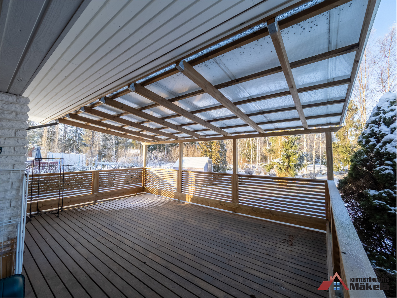 Makuuhuoneita tässä kodissa on kolme, joista päämakuuhuoneesta on yhteys olohuoneeseen sekä kylpy-ja saunatiloihin. Olohuone avautuu talon takapiha-alueelle, jossa sijaitsee osin katettu terassi iltapäivän auringon suuntaan. Keittiössä on moderni, vaalea värimaailma 2010-luvulla tehtyjen remonttien ansiosta. Myös kylpyhuone- ja saunatilat on remontoitu 2010-luvulla pienempien pintaremonttien lisäksi, joten yleisilme on tässä kodissa raikas.